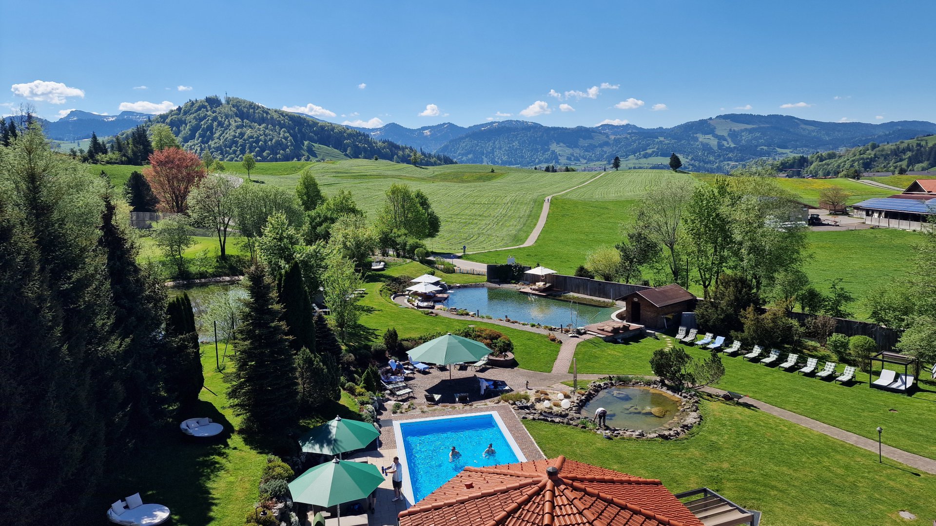 Eintauchen, auftauchen, aufatmen: bei uns schwimmen Sie indoor im Hallenbad mit Nagelfluh-Design, outdoor im beheizten Pool und im Badeteich im Einklang mit der Natur.