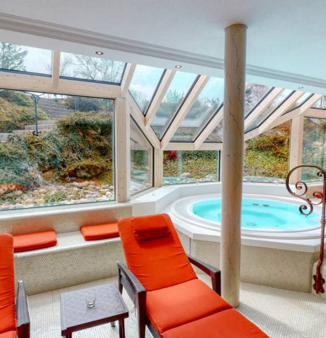 Im Haus befindet sich das Hallenbad mit belebtem Grander Wasser und einer angenehmen Temperatur von 29 °C. 6 × 12 Meter. Hier laden wir Sie auch zur Wassergymnastik ein.